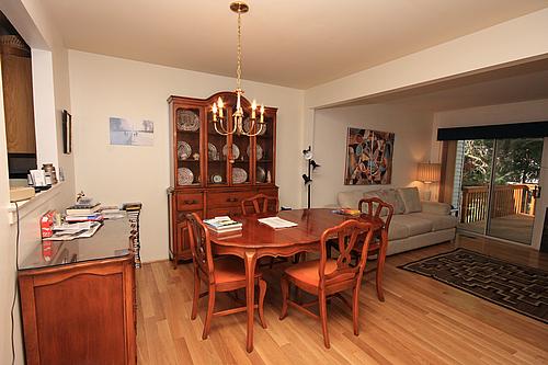 Dining Room with hardwood floor and passthrough to kitchen and adjacent to living room. There is a sliding glass door with a walkout to a large deck.
